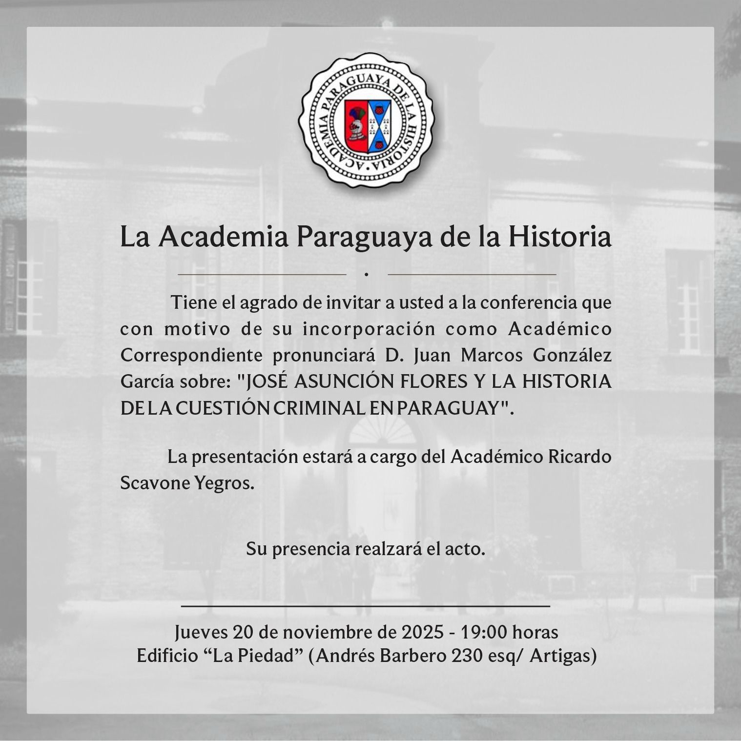 La Academia Paraguaya de la Historia tiene el honor de anunciar la incorporación del Dr. Juan Marcos González García como Académico Correspondiente, en el marco de un acto académico que se llevará a cabo el jueves 20 de noviembre de 2025, a las 19:00 horas, en el Edificio “La Piedad” (Andrés Barbero 230 esquina Artigas).