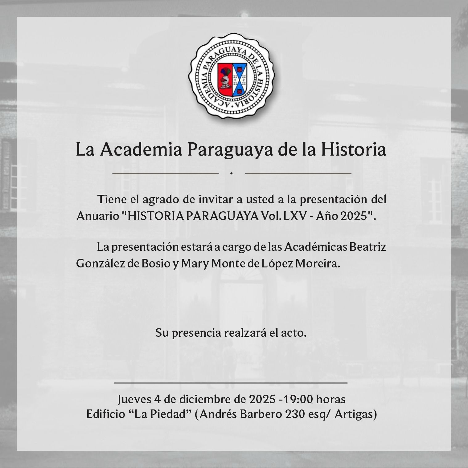 La Academia Paraguaya de la Historia expresa que la presencia del público interesado realzará el acto, reafirmando así su compromiso con la difusión del conocimiento histórico y la promoción de espacios de intercambio académico.