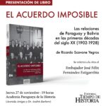 La Academia Paraguaya de la Historia tiene el honor de anunciar la próxima presentación del libro “El Acuerdo Imposible: Las relaciones de Paraguay y Bolivia en las primeras décadas del siglo XX (1902-1928)”, obra de Ricardo Scavone Yegros, publicada por Editorial Tiempo de Historia. El acto se llevará a cabo el jueves 27 de noviembre, […]